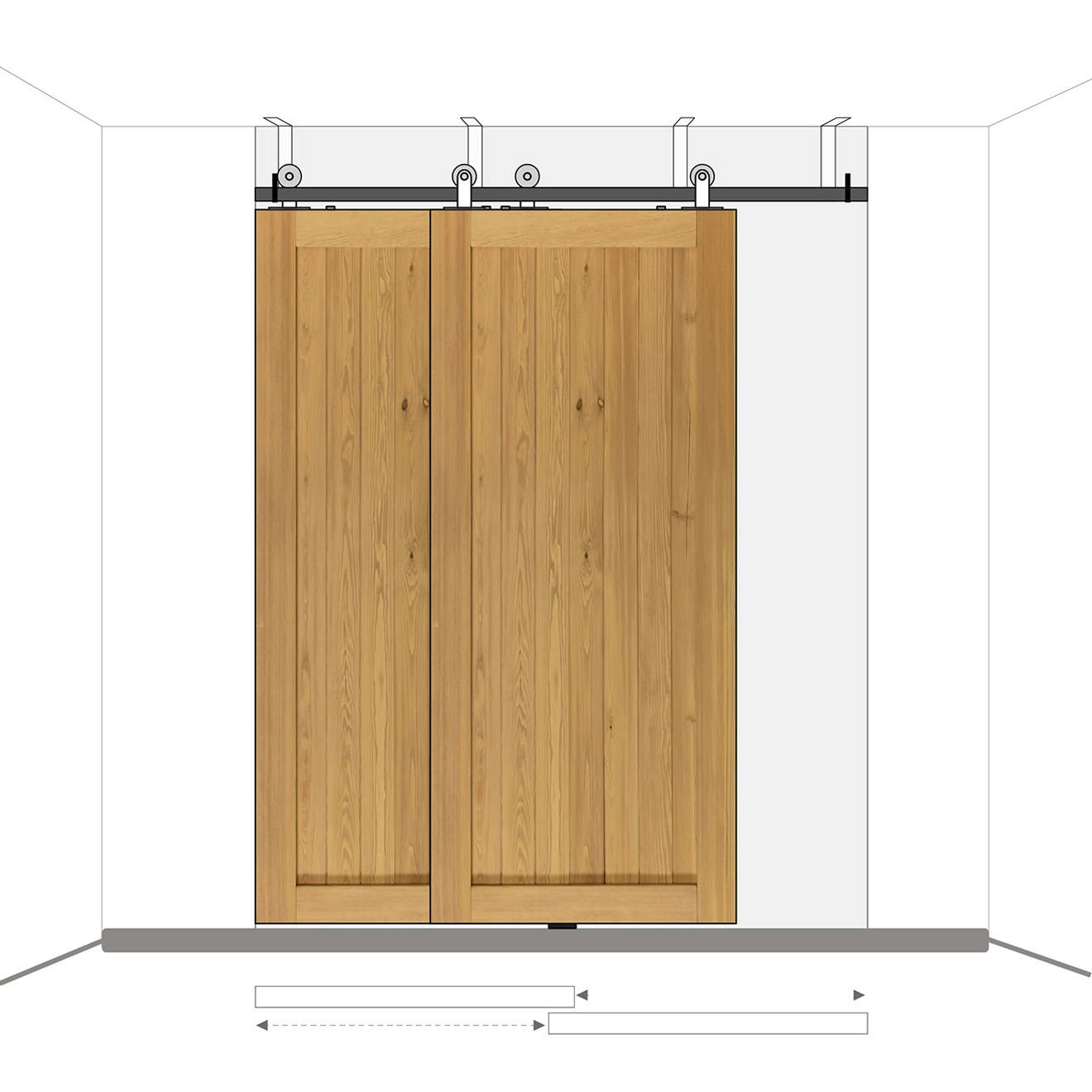 Bypass systems with two sliding tracks, in which the door leaves move on separate, parallel tracks. They require the installation of additional hangers on which a second track is installed. This allows the door leaves to fully overlap in the open position and can fully slide alternately one behind the other. Suitable for large door openings or entrances with limited space for a full-length track.