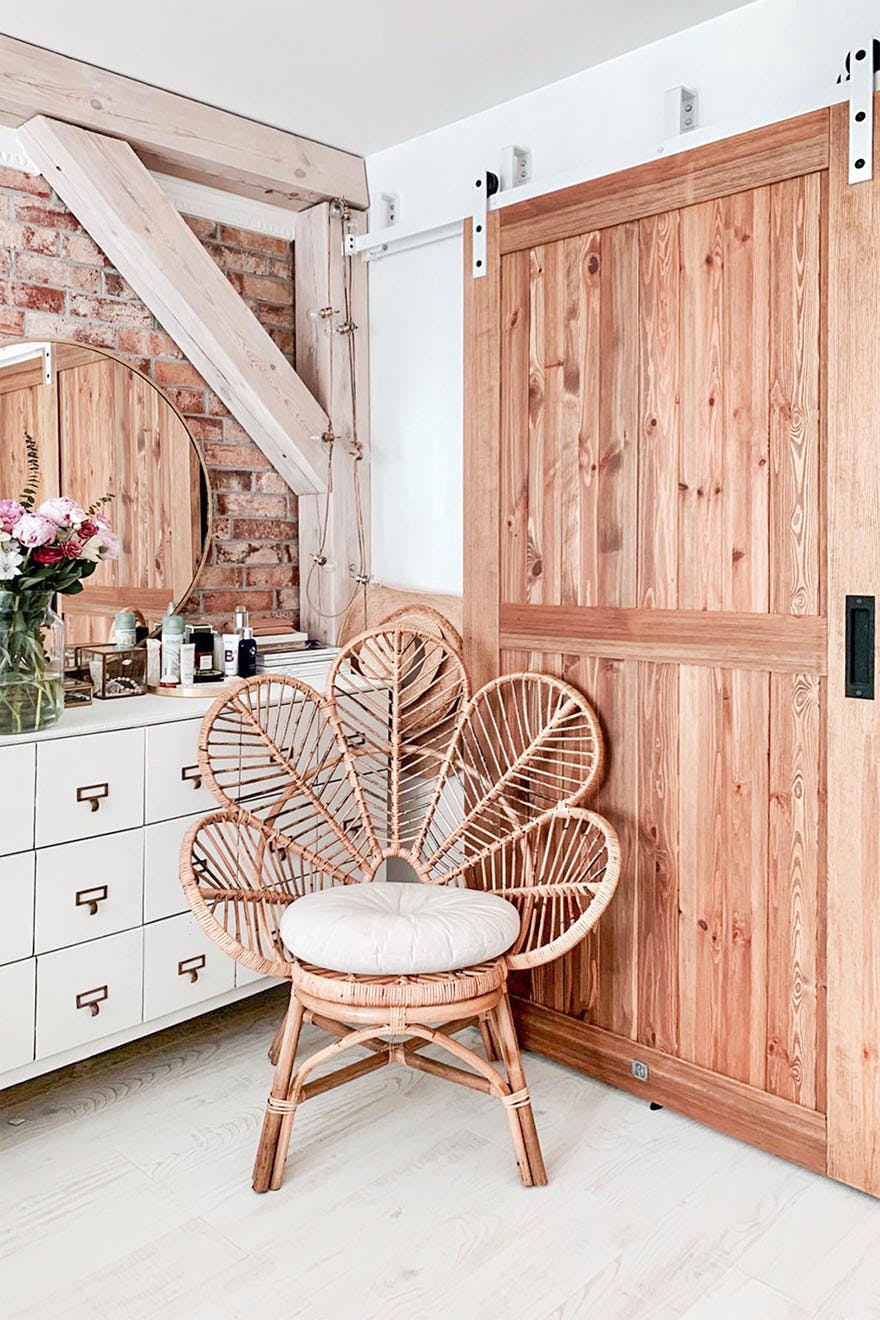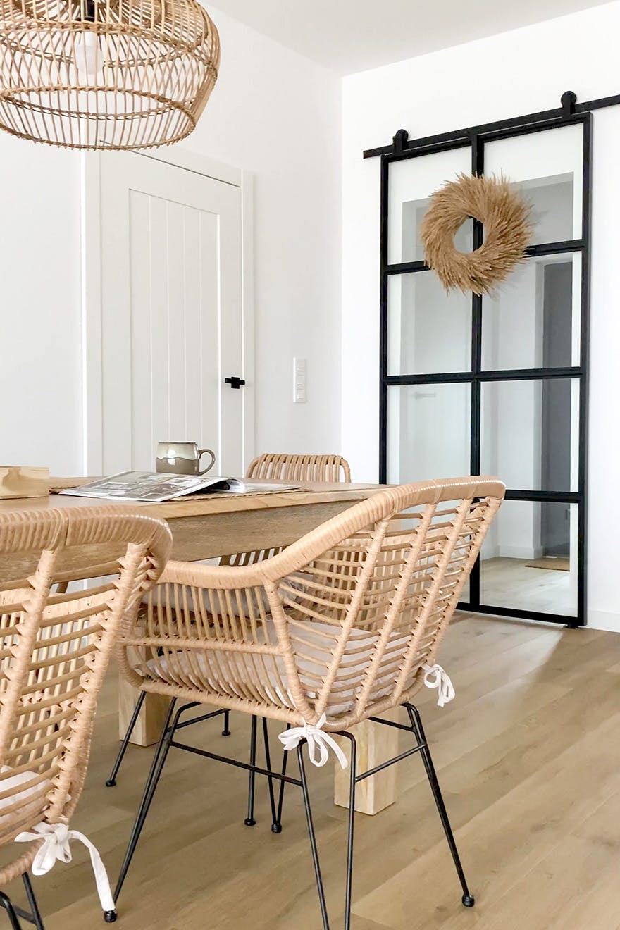Und da Sie nun wissen, warum es sich lohnt, dem Interieur mithilfe von Rattan ein wenig Magie zu verleihen, zeigen wir Ihnen einige interessante Inspirationen. Die Hauptelemente werden Rattanstühle, Kommoden, Paravents und … Türen sein. Richtig, Rattan-Schiebetüren sind eine fantastische Idee, um dem Innenraum Charakter zu verleihen.