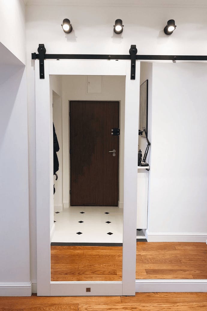 Hier kommt unser Held ins Spiel! Schiebetüren mit Spiegel, die Sie als Teil der Tür installieren können, die zum anderen Teil des Hauses oder zu einem anderen Raum führt. Sie werden das Problem des Platzmangels perfekt meistern und so dazu beitragen, dass ein paar Artikel mehr passen.