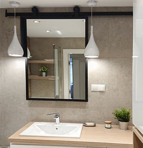 Das Badezimmer ist ein weiterer Ort, an dem Sie sich mit Spiegeln umgeben sollten. Wenn unser Badezimmer klein ist und Sie von einem Spiegel träumen, in dem Sie die gesamte Silhouette sehen können, kann sich die Schiebetür mit Spiegel als hervorragende Lösung für dieses Problem erweisen.