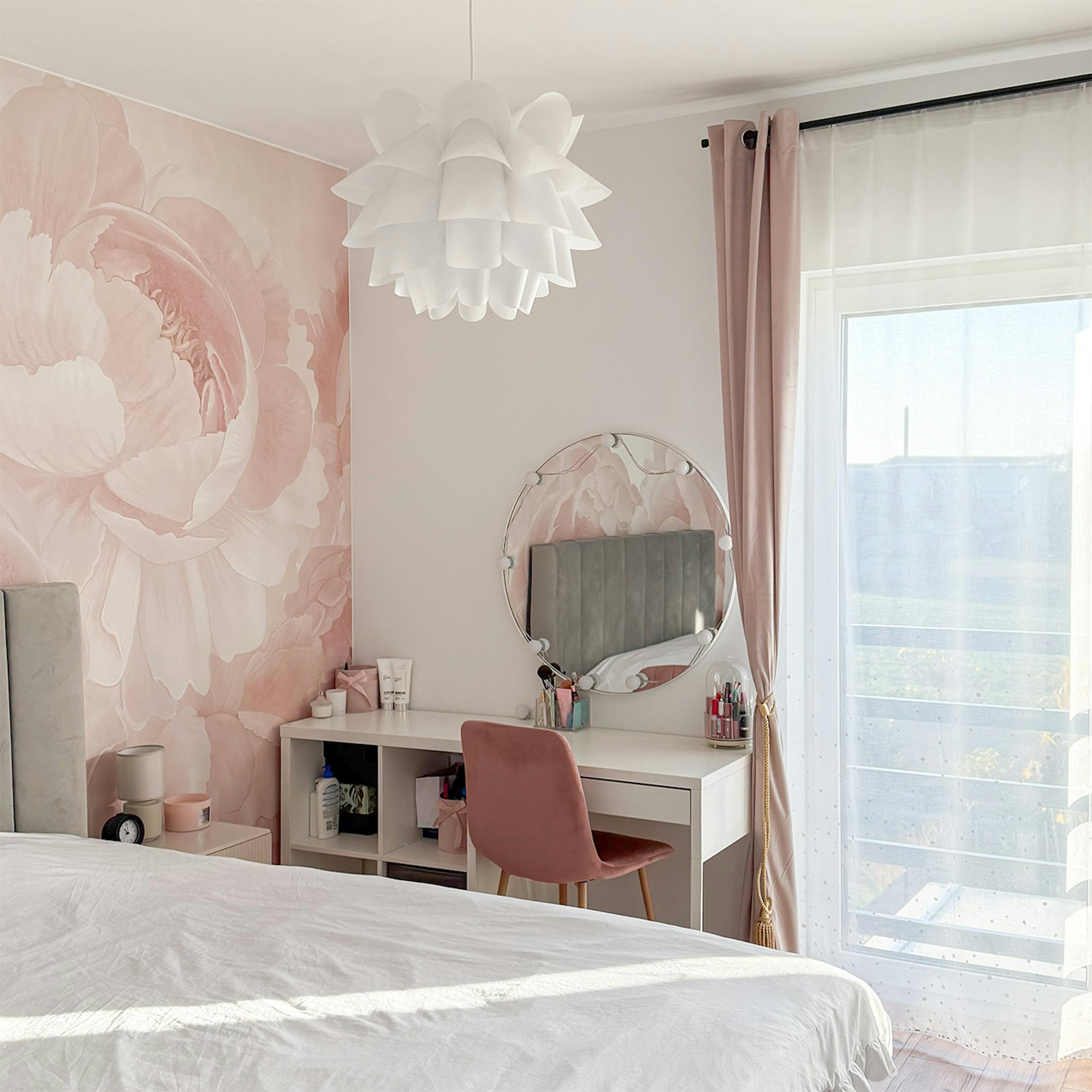 In der Ecke des Zimmers befindet sich ein funktionaler Bereich mit einem weißen Schminktisch und einem runden, im Hollywood-Stil beleuchteten Spiegel. Das durchdachte und stimmige Design wird durch Details wie einen dekorativen Spiegel in einem rosa, plissierten Rahmen, eine geschichtete weiße Hängelampe und weiche, plüschige Teppiche, die den Holzboden erwärmen, unterstrichen.