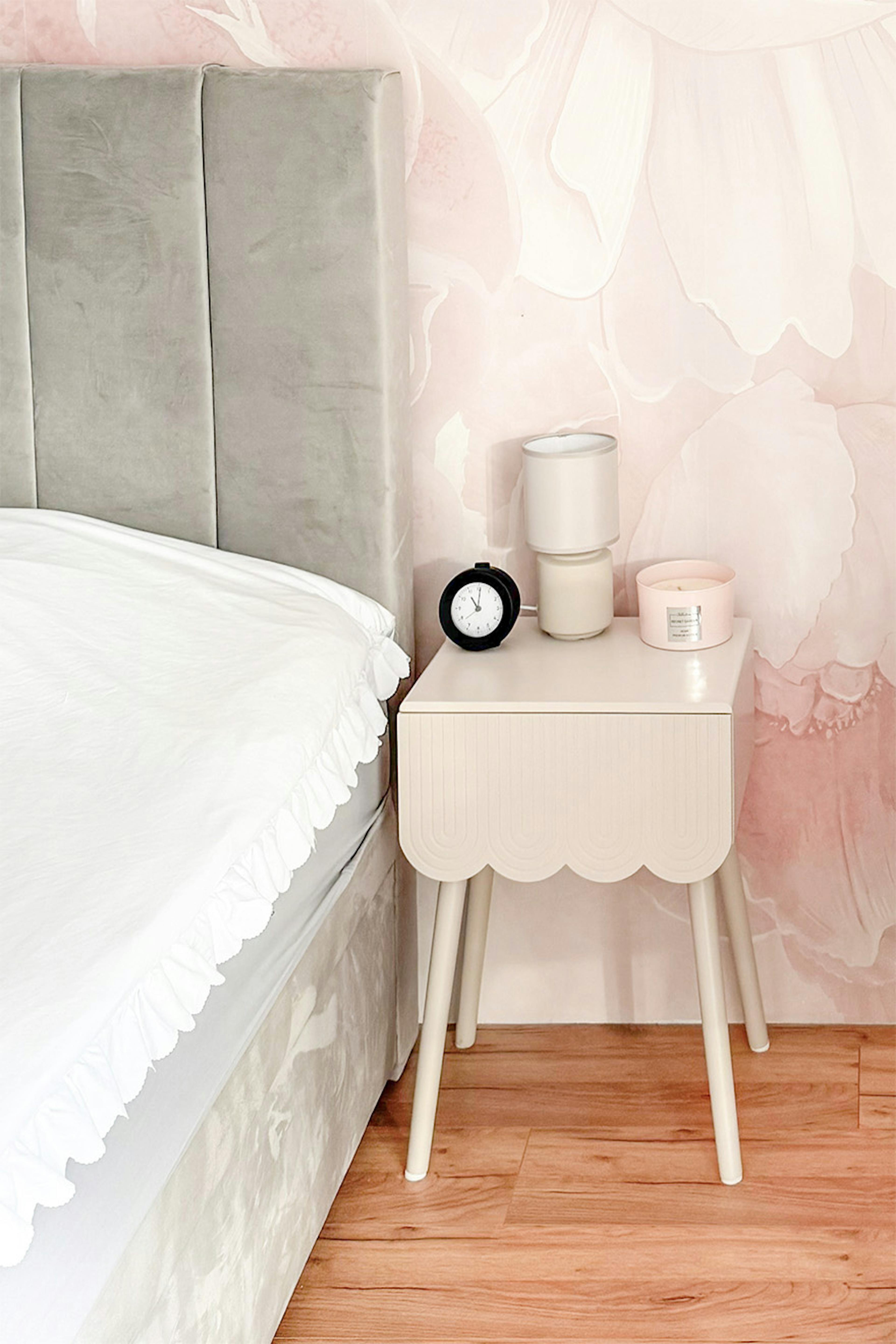 Das Herzstück des Schlafzimmers ist ein bequemes Bett mit einem grauen, gesteppten Kopfteil. Seine gedeckte Farbe bildet einen angenehmen Kontrast zu den hellen, rosa Accessoires. Die Wand hinter dem Kopfteil ziert eine großformatige Fototapete mit Blumenmotiv, die dem Raum Weichheit verleiht. An der gegenüberliegenden Wand erzeugen dünne Linien in Goldfarbe ein dynamisches, geometrisches Muster, das dem Interieur Dynamik und Tiefe schenkt.