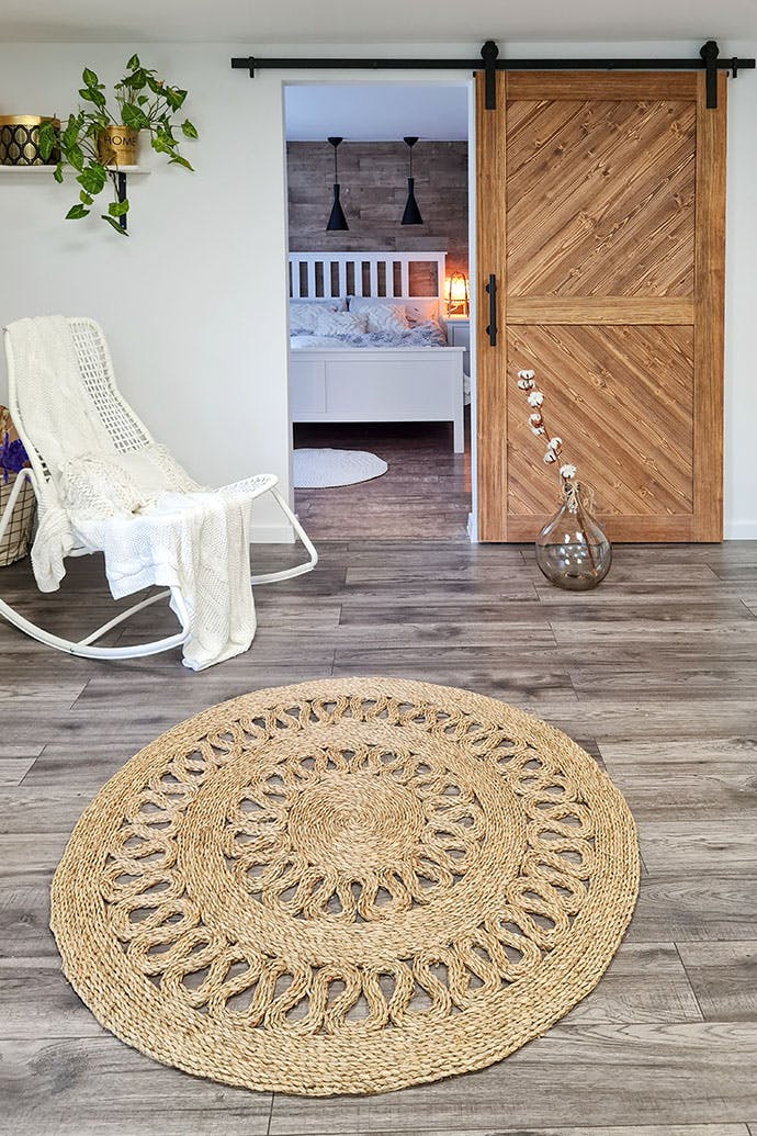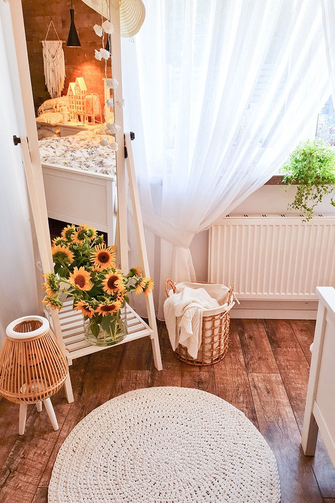 A house full of flowery decorations dominated by warm, natural colours and materials. Our wooden sliding doors have got a place in such an interior. They lead to a bedroom decorated in a Scandinavian style. In the bedroom, the basis of the arrangement is white wooden furniture completed with decorations and accessories made of natural materials.