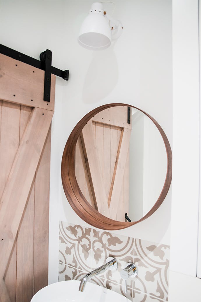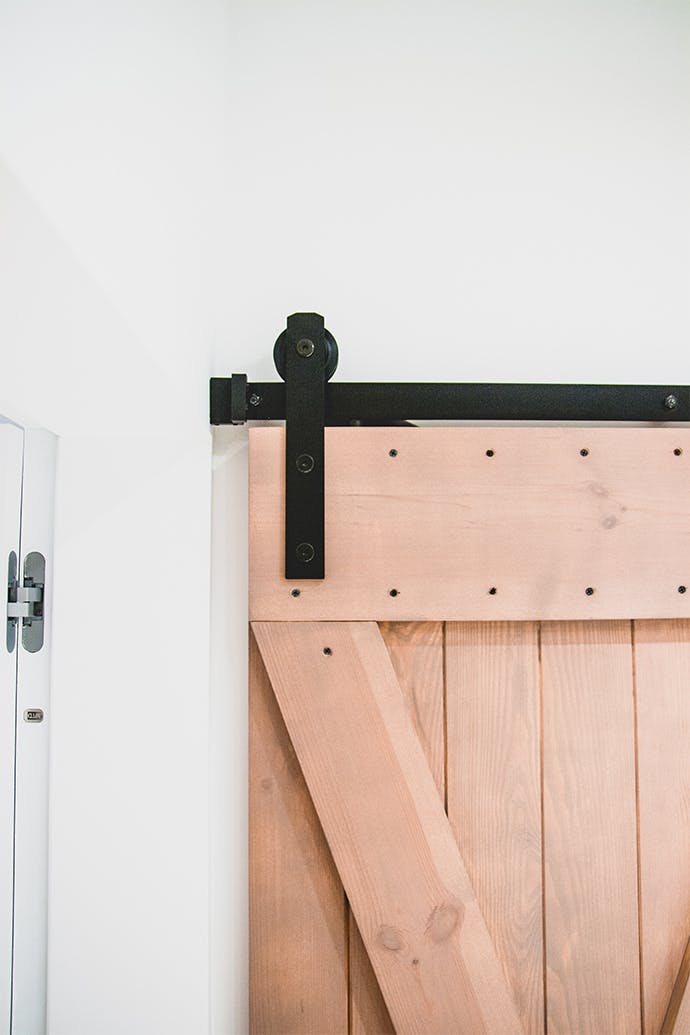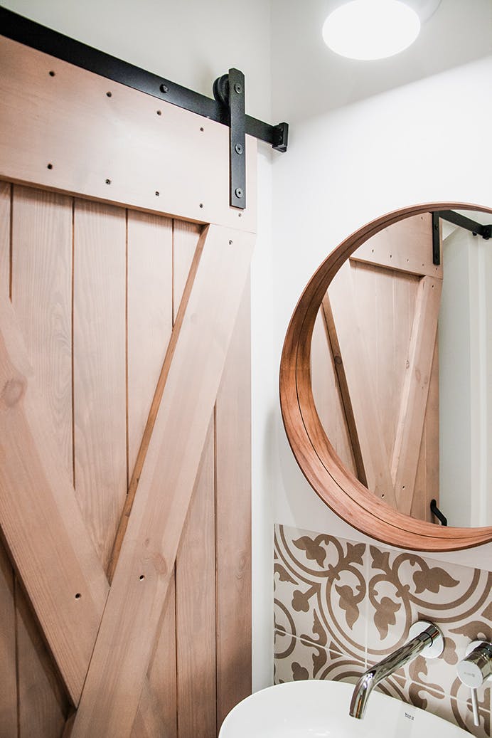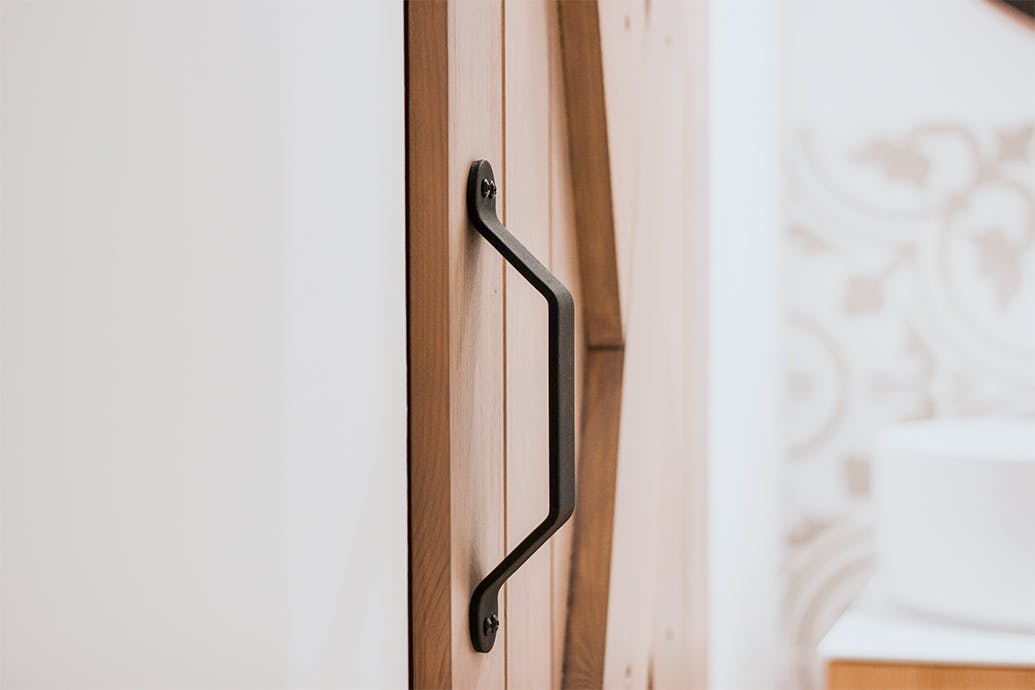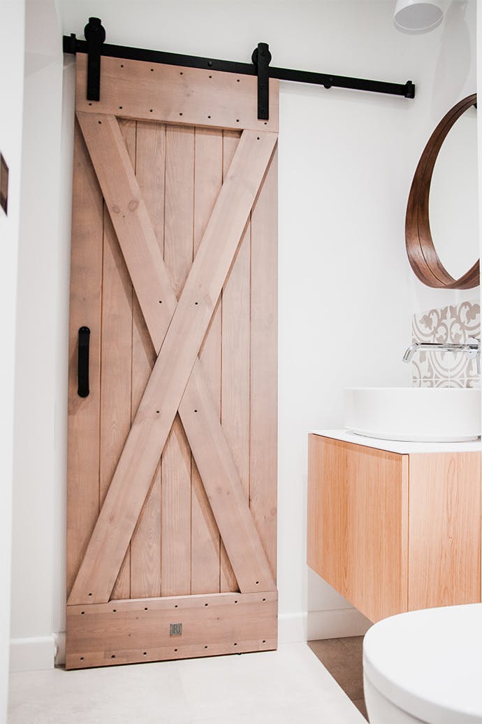 A sliding door in a small bathroom works as the entrance to an even smaller pantry hidden under the stairs. This charming apartment is located in a picturesque part of Warsaw. The sliding door, the Ikser model, is installed in the smallest bathroom, which also has a shower. This tiny but beautiful bathroom perfectly combines warm colours of wood and tiles. Our doors were bought by the customer to paint themselves, which means that the customer chose the colour and painted the door. The sliding door is above all functional, the niche in the bathroom could not be closed with other doors. The model from Rustical Line stands out in the modern bathroom interior and ensures cosiness. The use of sliding doors in the bathroom is always a controversial issue, but in this case, our door fits perfectly in the bathroom.