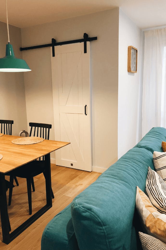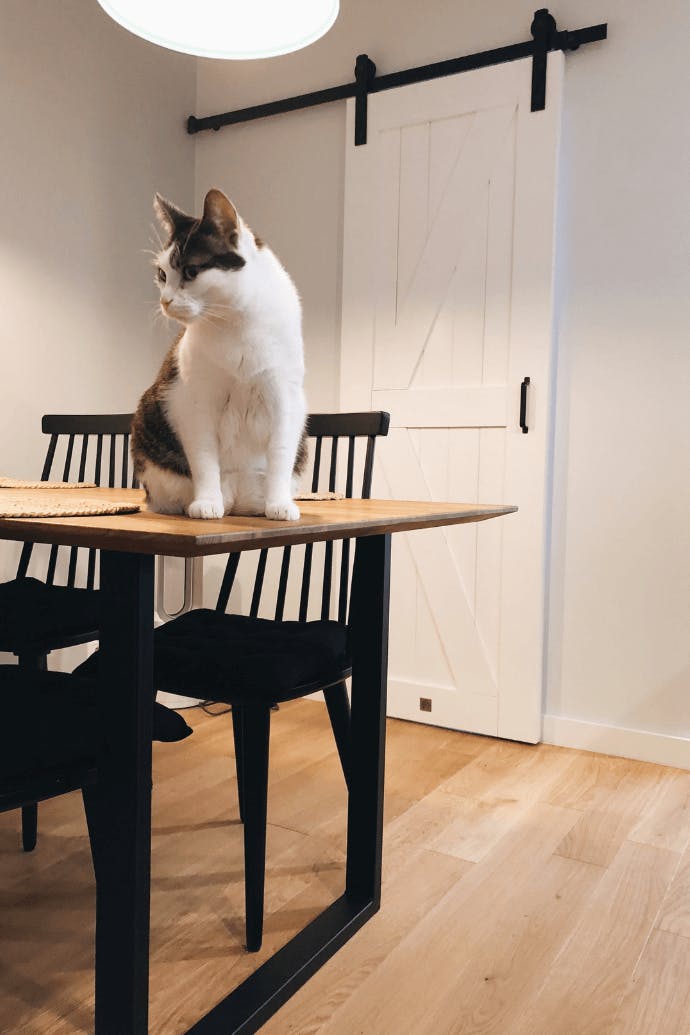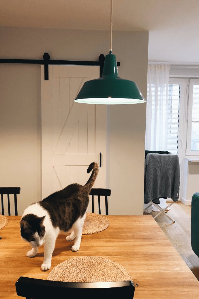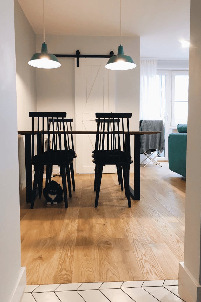 The Scandinavian industrial style has settled down for good in interior design. People who choose this style in their home want to know what to do to stand out from the others. This apartment captivates by its originality. The solutions used are eye-catching. The whole project was impressive right from the start. Beautiful floors, colours and furniture leave no doubt, the design was made by a passionate and professional. The white wooden sliding door was placed in the living room – behind it is a small utility room. The white-painted KAMA model fits wonderfully in industrial-Scandinavian climates. When we photographed this interior, we were constantly accompanied by two cats, which gave this apartment an unusual atmosphere.
